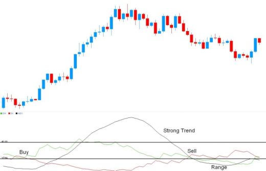 Also, signals can be obtained by looking at where the positive directional index +DI (green) and negative directional index -DI (red) lines cross each other. When the +DI crosses above the -DI from below, it is a bullish signal. When the -DI crosses above the +DI from below, it is bearish.