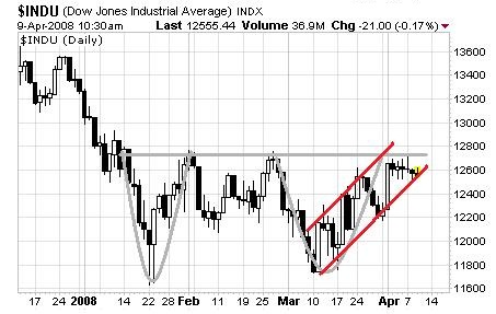 Sticking with the Dow as a measure for the broader market, it has rallied by about 1,000 points from the mid-March low. The Dow has done so in a very tight, aggressive, short-term ascending channel. This channel serves as the support and resistance for a bear flag. A breakdown from the bear flag would be defined with a drop below 12,500; confirmation of the bear flag would come on a drop below 12,200.