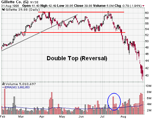 Support Break: Even after trading down to support, the double top and trend reversal are still not complete. Breaking support from the lowest point between the peaks completes the double top. This too should occur with an increase in volume and/or an accelerated descent.