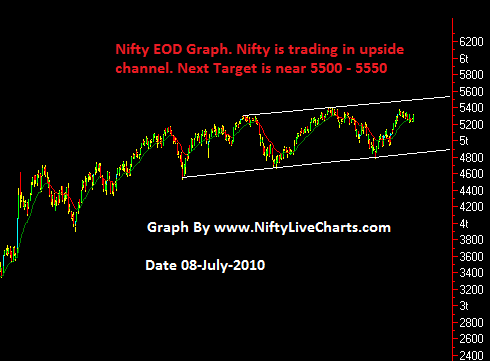 Nifty is trading in upside channel and has taken support as per the bottoms of channel. The upside resistance of nifty comes at around 5500 – 5550. So possibly in July itself we may see these levels