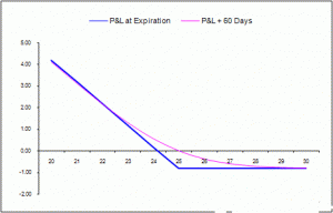 Upside Profit at Expiration: Strike Price – Stock Price at Expiration – Premium Paid