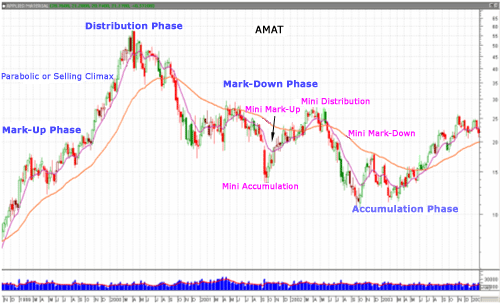 Figure 2: Weekly chart of Applied Materials (AMAT) from late 1998 to early 2004 showing different market phases and one cycle of mini-phases with 10-week (purple line) and 50-week (orange line) moving averages.