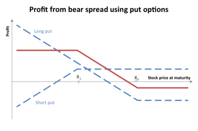 This spread is sometimes more broadly categorized as a “vertical spread”: a family of spreads involving options of the same stock, same expiration month, but different strike prices. They can be created with either all calls or all puts, and be bullish or bearish. The bear put spread, as any spread, can be executed as a “package” in one single transaction, not as separate buy and sell transactions. For this bearish vertical spread, a bid and offer for the whole package can be requested through your brokerage firm from an exchange where the options are listed and traded.