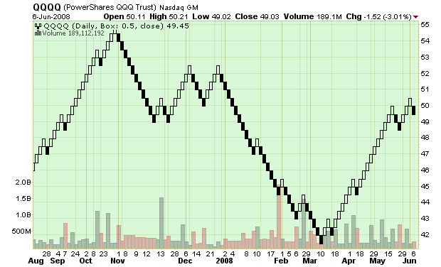 It’s important to note that prices may exceed the top (or bottom) of the current brick. Again, new bricks are only added when prices completely “fill” the brick. For example, for a 5-point chart, if prices rise from 98 to 102, the hollow brick that goes from 95 to 100 is added to the chart BUT the hollow brick that goes from 100 to 105 is NOT DRAWN. The Renko chart will give the impression that prices stopped at 100.
