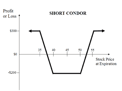 The short condor is a strategy very similar to the short butterfly. It is a limited risk, limited profit trading strategy that is structured to earn a profit when the underlying stock is perceived to be making a sharp move in either direction. Using calls, the options trader can setup a short condor by combining a bear call spread and a bull call spread. The trader enters a short call condor by buying a lower strike in-the-money call, selling an even lower striking in-the-money call, buying a higher strike out-of-the-money call and selling another even higher striking out-of-the-money call. A total of 4 legs are involved in this trading strategy and a net credit is received on entering the trade.