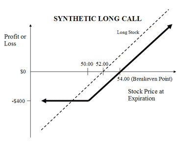 A synthetic long call is created when long stock position is combined with a long put of the same series. It is so named because the established position has the same profit potential as a long call.
