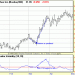 The Chaikin Volatility Indicator uses the percent change of two moving averages of a volume weighted accumulation-distribution line to determine the volatility of a financial data series. Chaikin quantifies volatility as a widening of the range between the high and the low price of a security. This does not take trading gaps into account as Average True Range does. As shown … [Read more...]