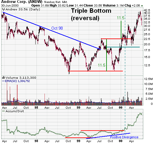 Resistance Turns Support: Broken resistance becomes potential support, and there is sometimes a test of this newfound support level with the first correction. Because the triple bottom is a long-term pattern, the test of newfound support may occur many months later.