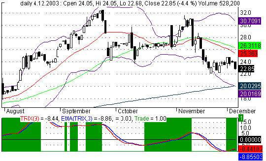 As well as a momentum indicator, TRIX (the Triple Exponential Moving Average) is an oscillator which follows overbought and oversold markets. For that watch a negative value demonstrate an oversold market and positive value to demonstrate an overbought market. When TRIX is used as a momentum indicator, a negative value suggests momentum is decreasing while a positive value suggests increasing momentum. Some analysts think that the TRIX crossing above the zero line is a purchase signal and a closing below the zero line is a sell signal. Distinction between price and TRIX can also show important market turning points.