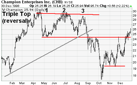 Volume: As the triple top develops, overall volume levels usually decline. Volume sometimes increases near the highs. After the third high, an expansion of volume on the subsequent decline and at the support break greatly reinforces the soundness of the pattern.