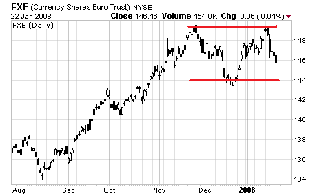 We’re watching the unfolding of a potential double top in the Euro Currency Shares Trust (FXE). This ETF tracks the EUR/USD exchange rate.