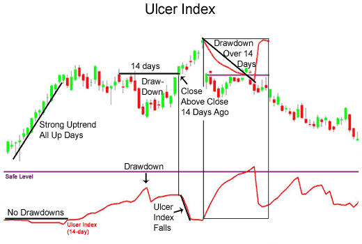 The Ulcer Index is a market risk measure or technical analysis indicator. It was developed Peter Martin and Byron McCann. It has been designed as a measure of volatility, but only volatility in the downward direction but the amount of drawdown or retrenchment occurring over a period.