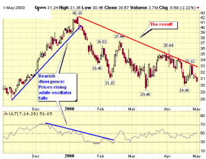The Ultimate Oscillator, developed by Larry Williams combines a stock’s price action during three different time frames into one bounded oscillator. Values range from 0 to 100 with 50 as the center line. Oversold territory exists below 30 and overbought territory extends from 70 to 100.