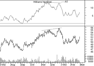 Prices making a new low along with the A/D indicator failing to reach a new low suggest that accumulation is taking place and creates a buy signal. Prices making a new high and the indicator failing to make new highs suggest distribution is taking place and creates a sell signal.